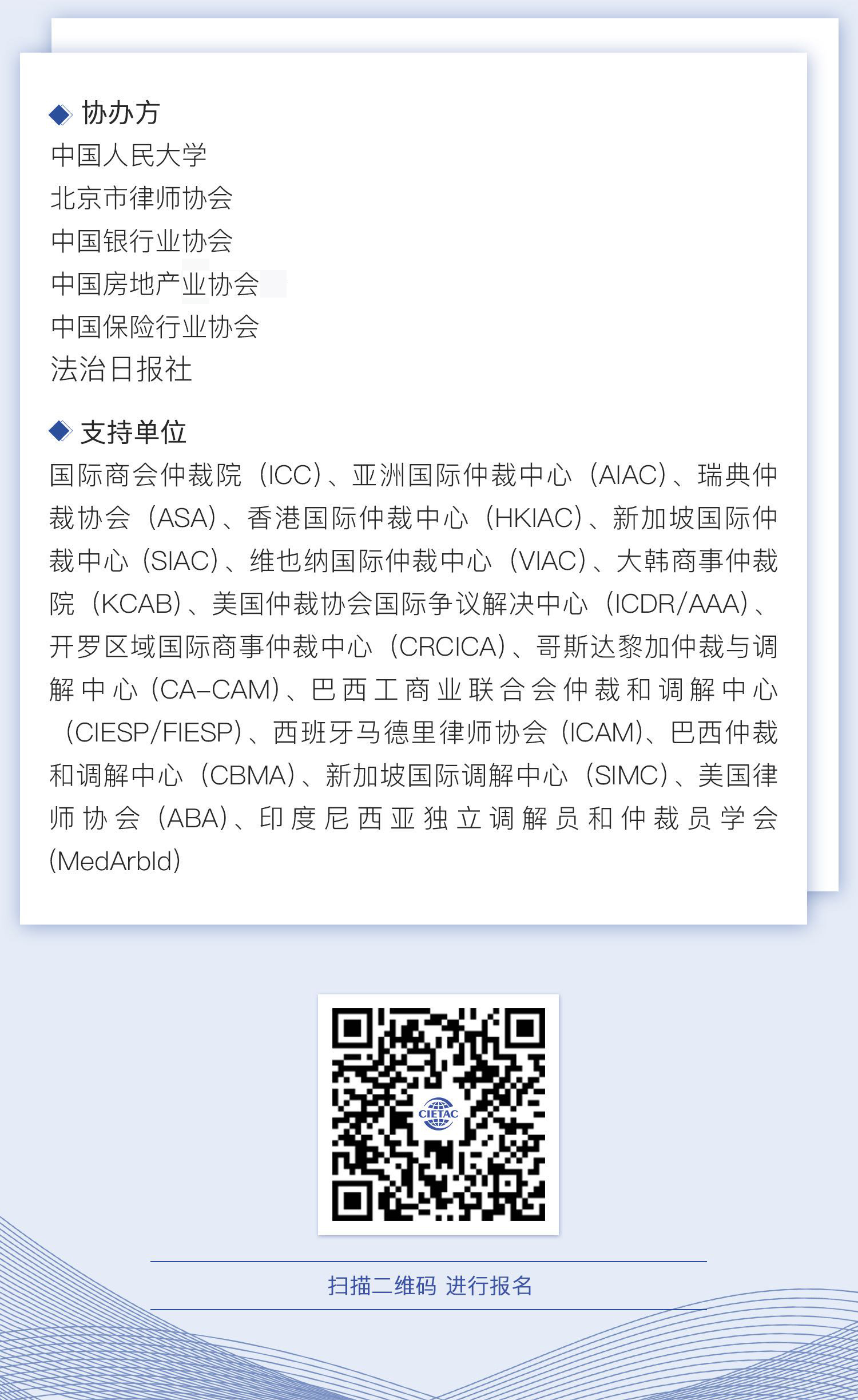 请预留时间并通过扫码或点击“阅读原文”进行报名。报名链接:http://h5.ebdan.net/ls/ZkOwaYkV 本次会议不收取任何费用,注册用户将享有如下权益: 1、2020中国仲裁高峰论坛电子版定制邀请函 报名注册后,收到论坛主办方发出的专属定制(姓名+唯一编号)活动邀请函。 2、论坛直播观看地址及会议手册的定向推送 在论坛直播前,陆续收到活动直播地址、电子会议手册以及参会提醒。 3、《2020中国仲裁高峰论坛电子会刊》 论坛结束后,收到电子版《2020中国仲裁高峰论坛会刊》以作留念。