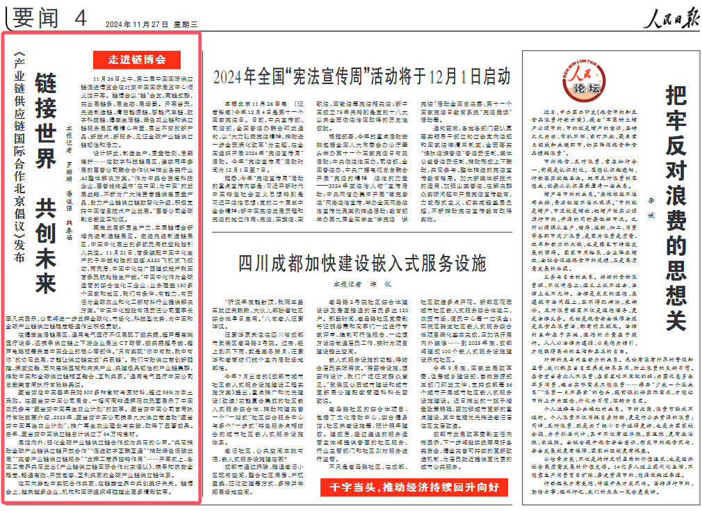 展馆内外,强化全球产业链供应链合作成为共同的心声。“共同推动全球产业链供应链开放合作”“促进数字互联互通”“推动绿色低碳发展”“完善产业链供应链服务”“发挥工商界独特作用”……开幕式上,各国工商界共同发出《产业链供应链国际合作北京倡议》,携手构筑安全稳定、畅通高效、开放包容、互利共赢的全球产业链供应链体系。
